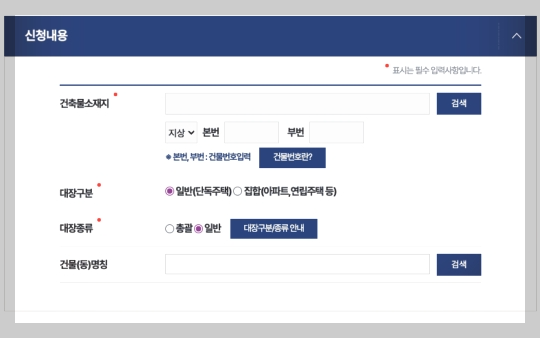 계약할 집 주소를 적은 후, 일반(단독주택) 또는 집합(아파트, 연립주택 등)중 하나를 선택하고, 대장 종류는 '일반'에 두고 검색합니다.