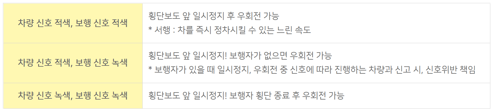 차량 신호가 적색이지만 보행자 신호가 녹색이면 정지선에서 정지한 후 건너는 또는 건너려는 사람이 있는지 확인하면서 서행해야 합니다.