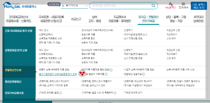 - 홈택스 접속 후 메인화면 상단의 메뉴 중 '장려금, 연말정산, 전자기부금' 선택