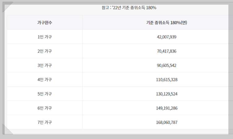- 가구 소득 조건: 가구원 수에 따른 기준 중위소득 180% 이하에 해당해야 합니다.