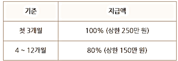 - 지원내용 : 육아휴직 첫 3개월 통상임금의 100% (상한액 월 250만원) 지급, 4개월 째부터는 통상임금의 80% (상한액 월 150만원) 지급