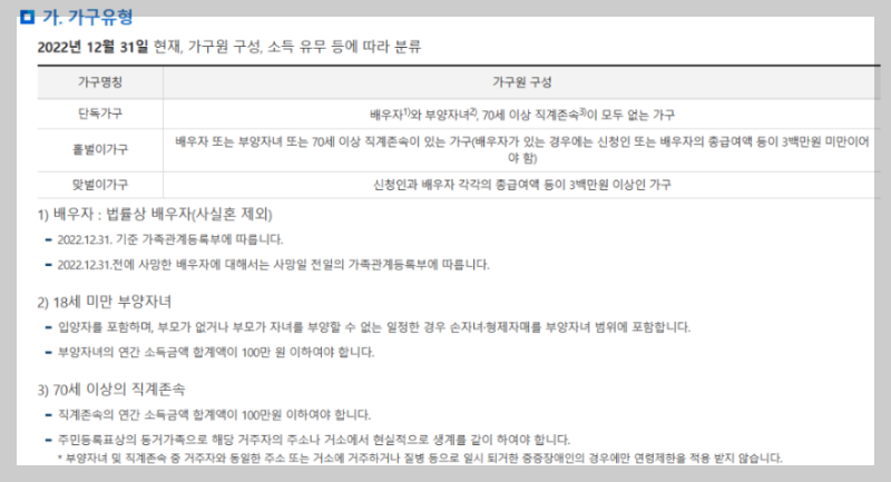 - 단독 : 배우자, 부양자녀, 70세 이상 직계존속이 아무도 없는 정말 혼자 사는 가구